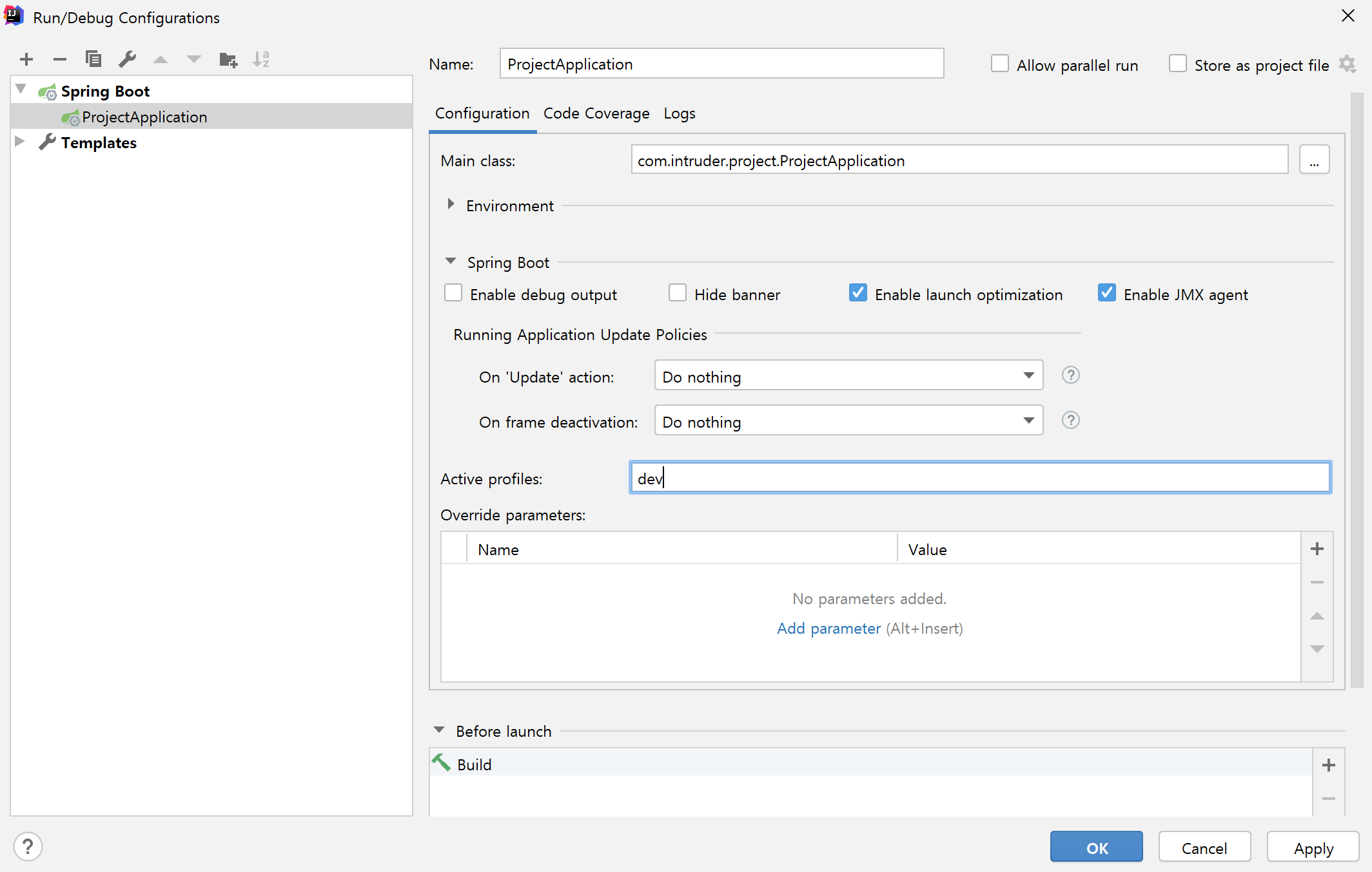 설정 창으로 들어가 보면 Active profiles 이라고 작성 하는 부분이 있는데 여기에 dev 또는 oper을 작성하고